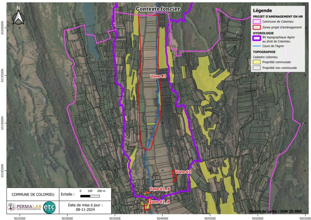 Le projet AMI déposé par Colomieu auprès de l’agence de l’eau RM&C propose d’acquérir une bande de 20m de large pour faciliter le processus de divagation naturelle de la rivière. Cette maîtrise foncière n’est pas encore acquise à la date de publication de la présente fiche (septembre 2025). Un premier projet de reméandrage a été examiné et abandonné, jugé à la fois trop coûteux, et trop exigeant en matière de foncier agricole.