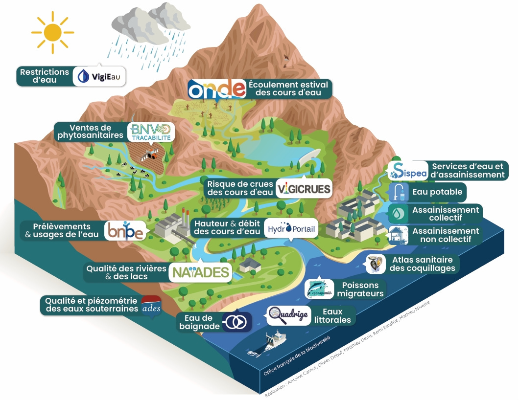 Le site public réunit, en un seul endroit, les grandes sources d’information sur l’eau en France : qualité, hydrologie, étiages et crues, services d’eau potable, d’assainissement collectif ou individuel, prélèvements, bassins hydrographiques… Chaque domaine dispose de sa propre porte d’entrée vers les données publiques. Pour illustrer cette richesse, l’Office Français de la Biodiversité propose une infographie synthétique qui donne accès aux seize principales bases de données sur l’eau.