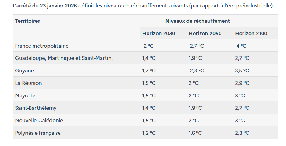 L’arrêté définit les niveaux de réchauffement, par rapport à l’ère préindustrielle, auxquels s’adapter. Pour la France hexagonale, la trajectoire prévoit un réchauffement de 2 °C à l’horizon 2030, de 2,7 °C à l’horizon 2050 et de 4 °C à l’horizon 2100.