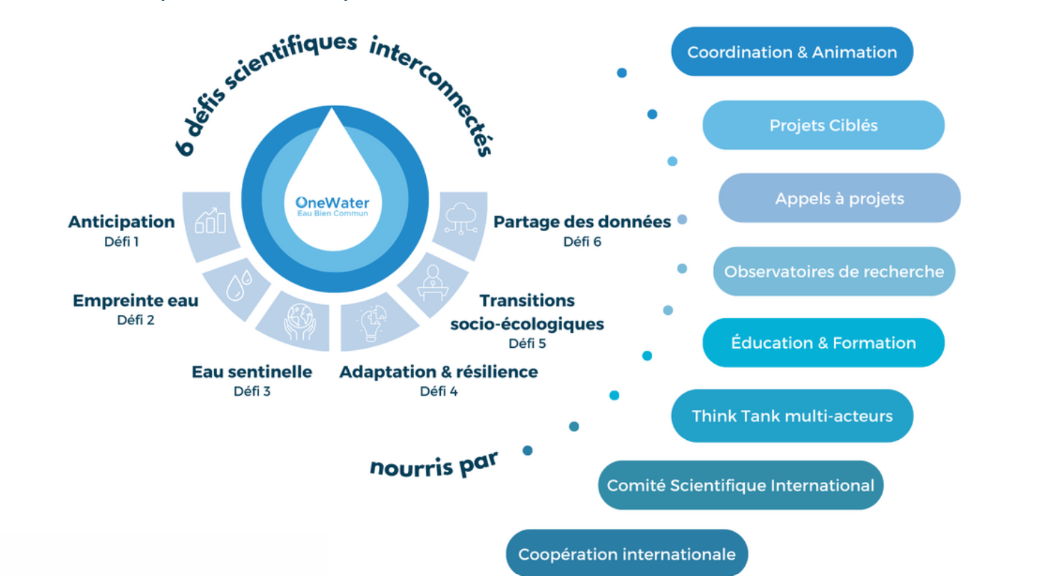 Le programme s’appuie en effet sur un comité Scientifique international et sur le Think Tank OneWater. L’Etat, les collectivités territoriales, la filière eau, les usagers, des ONG et des chercheurs, et d’autres y sont notamment représentés. Par cet interface, OneWater souhaite fédérer et accompagner l’ensemble des parties prenantes vers les transitions nécessaires pour répondre aux enjeux environnementaux et de sociétés.